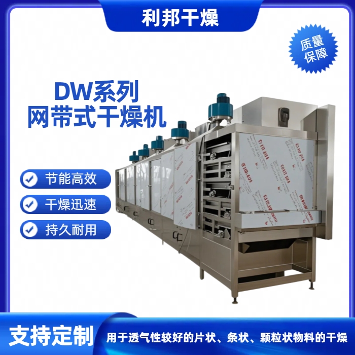 物料由加料器均匀地铺在网带上,网带在传动装置拖动下在干燥机内移动。干燥机由若干单元组成,每一单元热风独立循环,热气由下往上或由上往下穿过物料,加热干燥并带走水分,干燥后的成品连续落入收料器中。