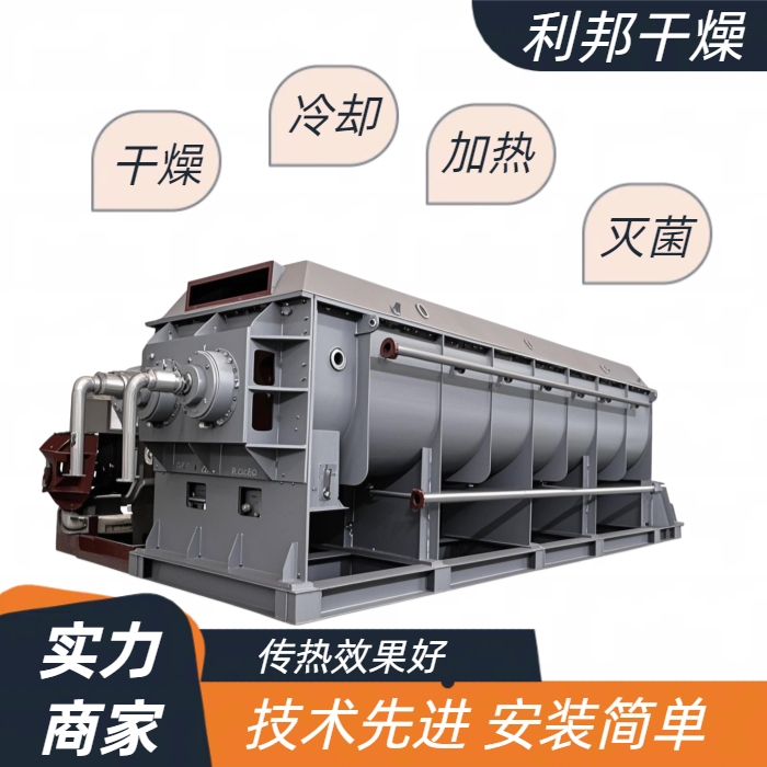 空心轴上密集排列着楔型中空浆叶,热介质经空心轴流经浆叶。单位有效容积内传热面积很大,热介质温度从-40℃到320℃,可以是水蒸汽,也可以是液体型:如热水、导热油等。间接传导加热,没有携带空气带走热量,热量均用来加热物料。热量损失仅为通过器体保温层向环境的散热。楔型浆叶传热面具有自清洁功能。物料颗粒与楔型面的相对运动产生洗刷作用,能够洗刷掉楔型面上附着物料,使运转中一直保持着清洁的传热面。浆叶干燥机的壳体为Ω型,壳体内一般安排二到四根空心搅拌轴。壳体有密封端盖与上盖,防止物料粉尘外泄而充分发挥作用。
