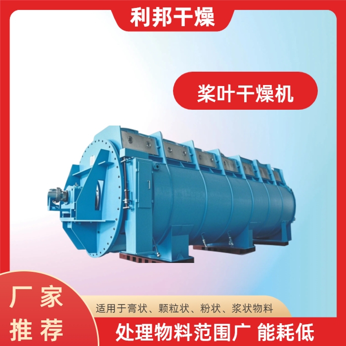 空心轴上密集排列着楔型中空浆叶,热介质经空心轴流经浆叶。单位有效容积内传热面积很大,热介质温度从-40℃到320℃,可以是水蒸汽,也可以是液体型:如热水、导热油等。间接传导加热,没有携带空气带走热量,热量均用来加热物料。热量损失仅为通过器体保温层向环境的散热。楔型浆叶传热面具有自清洁功能。物料颗粒与楔型面的相对运动产生洗刷作用,能够洗刷掉楔型面上附着物料,使运转中一直保持着清洁的传热面。浆叶干燥机的壳体为Ω型,壳体内一般安排二到四根空心搅拌轴。壳体有密封端盖与上盖,防止物料粉尘外泄而充分发挥作用。