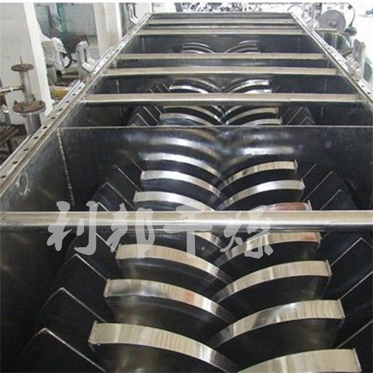 空心轴上密集排列着楔型中空浆叶,热介质经空心轴流经浆叶。单位有效容积内传热面积很大,热介质温度从-40℃到320℃,可以是水蒸汽,也可以是液体型:如热水、导热油等。间接传导加热,没有携带空气带走热量,热量均用来加热物料。热量损失仅为通过器体保温层向环境的散热。楔型浆叶传热面具有自清洁功能。物料颗粒与楔型面的相对运动产生洗刷作用,能够洗刷掉楔型面上附着物料,使运转中一直保持着清洁的传热面。浆叶干燥机的壳体为Ω型,壳体内一般安排二到四根空心搅拌轴。壳体有密封端盖与上盖,防止物料粉尘外泄而充分发挥作用。