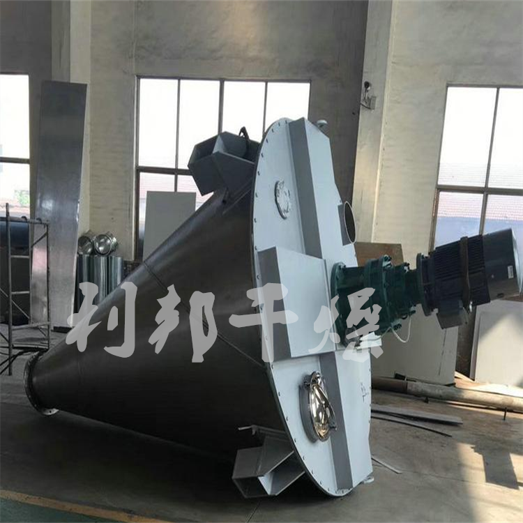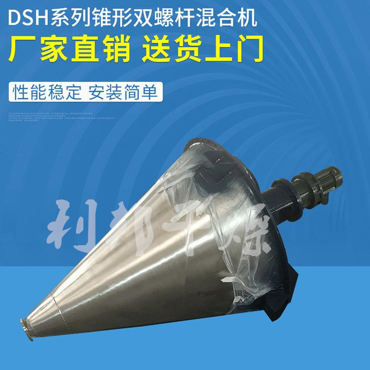 DSH系列的锥形混合机筒内两只非对称螺旋自转将物料向上提升,转臂慢速公转运动;使螺旋外的物料,不同程度进入螺柱,从而达到全圆周方位物料的不断更新扩散,被提到上部的两股物料再向中心凹穴汇合,形成一股向下的物料流,补充了底部的空缺,从而形成对流循环的三重混合效果;标准型锥形螺旋混合机有两根搅拌螺旋,实际应用中根据设备规格大小可以采用单(一根长螺旋)、双(长短各一两根不对称螺旋)、三(两短一长对称布置)根螺旋;理论上搅拌螺旋越多,混合效果越好;设备一般采用梅花状"错位阀",此阀与长螺旋底部贴合紧密,有效减少混合死角,驱动形式有手动和气动可选;根据用户需要,也可加装蝶阀、球阀、星形卸料器、边出料等。
