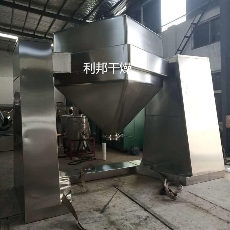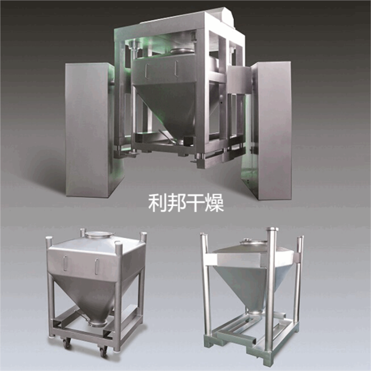 将物料装入方锥形密闭混合桶内,料斗对称的轴线与回转轴轴线成一夹角,不同组分物料在密闭的料斗中进行三维空间运动,产生强烈翻转和扩散收缩作用,达到佳的混合效果。