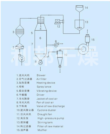 压力喷雾干燥机是一种可以同时完成干燥和造粒的装置。按工艺要求可以调节料液泵的压力、流量、喷孔的大小。得到所需的一定大小比例的球形颗粒。