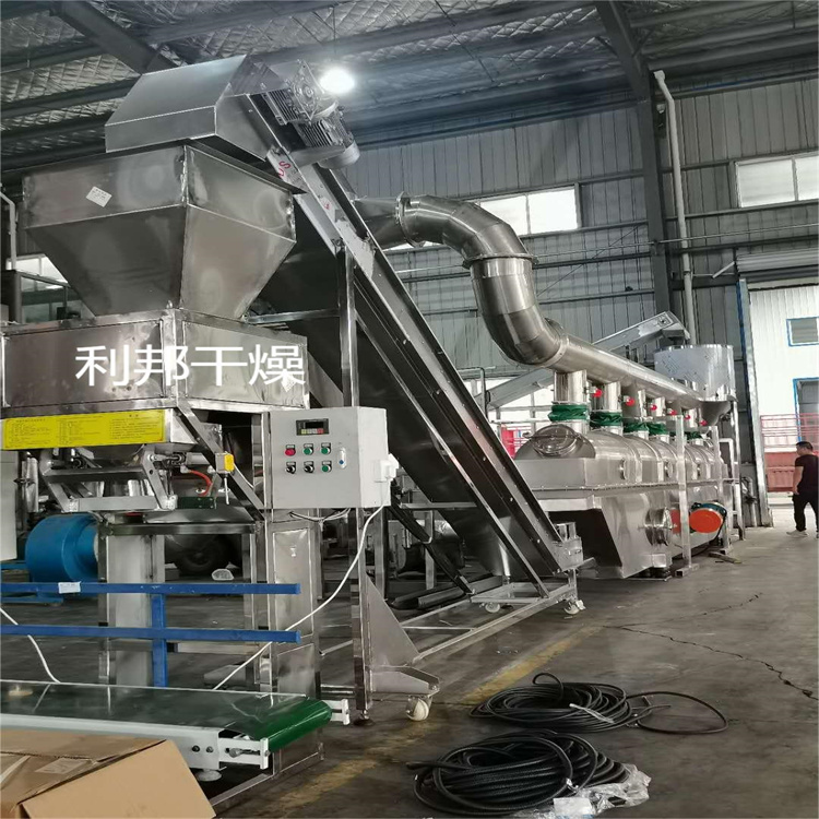 物料自进料口进入机内,在振动力作用下,物料沿水平方向抛掷向前连续运动,热风向上穿过流化床同湿物料换热后,湿空气经旋风分离器(或脉冲式布袋除尘器)除尘后由排风排出,干燥物料由排料口排出,然后收集包装。