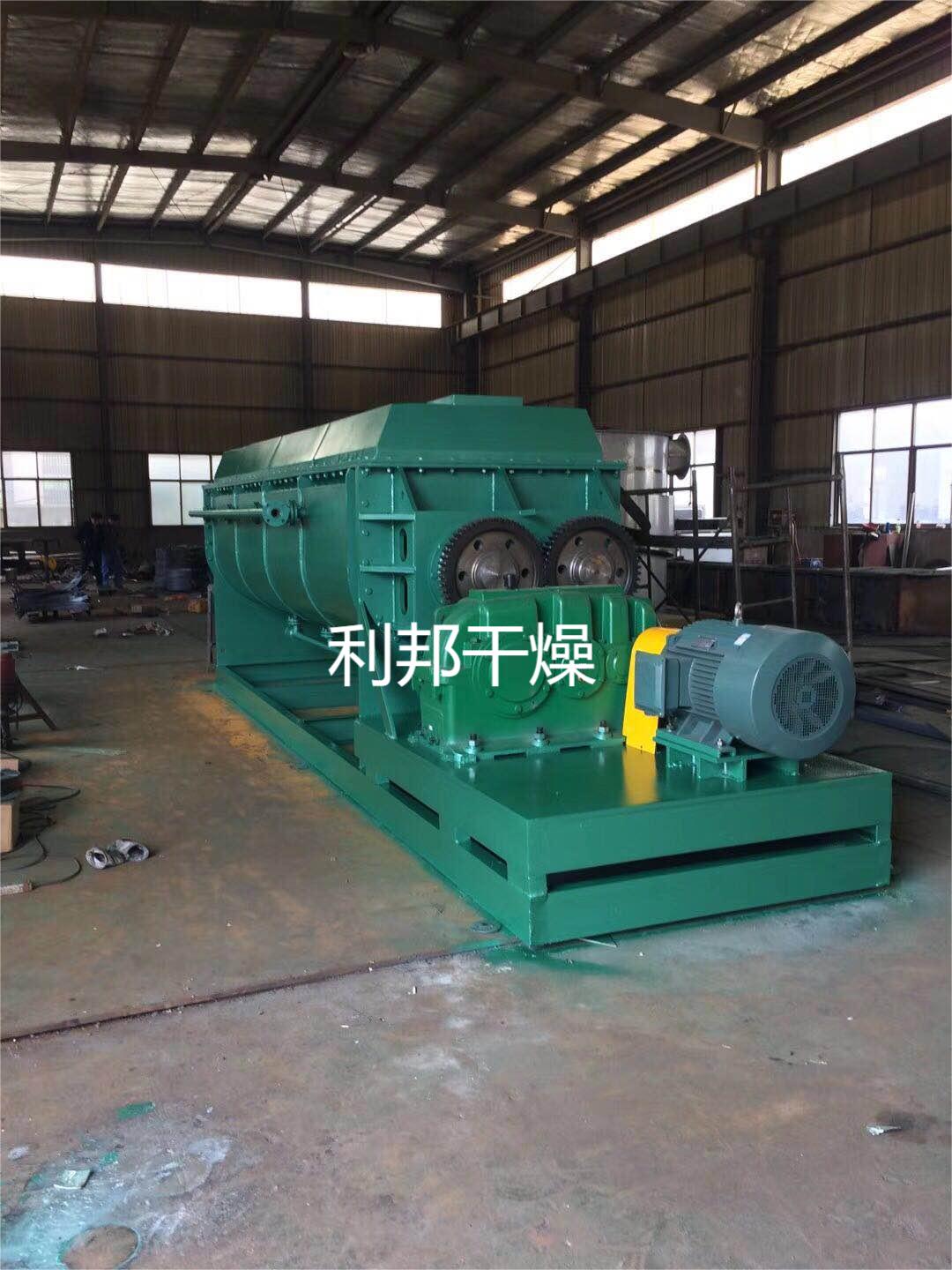 空心轴上密集排列着楔型中空浆叶,热介质经空心轴流经浆叶。单位有效容积内传热面积很大,热介质温度从-40℃到320℃,可以是水蒸汽,也可以是液体型:如热水、导热油等。间接传导加热,没有携带空气带走热量,热量均用来加热物料。热量损失仅为通过器体保温层向环境的散热。楔型浆叶传热面具有自清洁功能。物料颗粒与楔型面的相对运动产生洗刷作用,能够洗刷掉楔型面上附着物料,使运转中一直保持着清洁的传热面。浆叶干燥机的壳体为Ω型,壳体内一般安排二到四根空心搅拌轴。壳体有密封端盖与上盖,防止物料粉尘外泄而充分发挥作用。