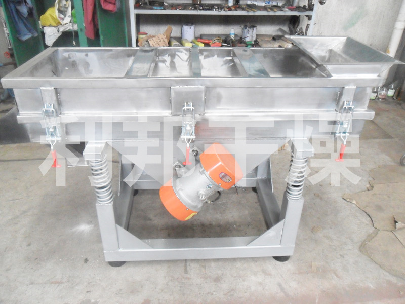 本机上部采用快拆式手柄,把整机连成一个整体,上盖全密封、有效防止物料在过筛时由于振动而产生粉尘飞扬。筛体下部安装振动电机,有效保证了物料的结构紧凑,下部采用弹簧减振,使整机在平稳状态下工作。下面底座采用可调式,可调节正在过筛时的筛面倾斜角度,根据物料特性以取得过筛效果。