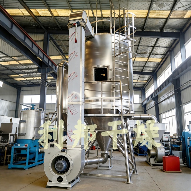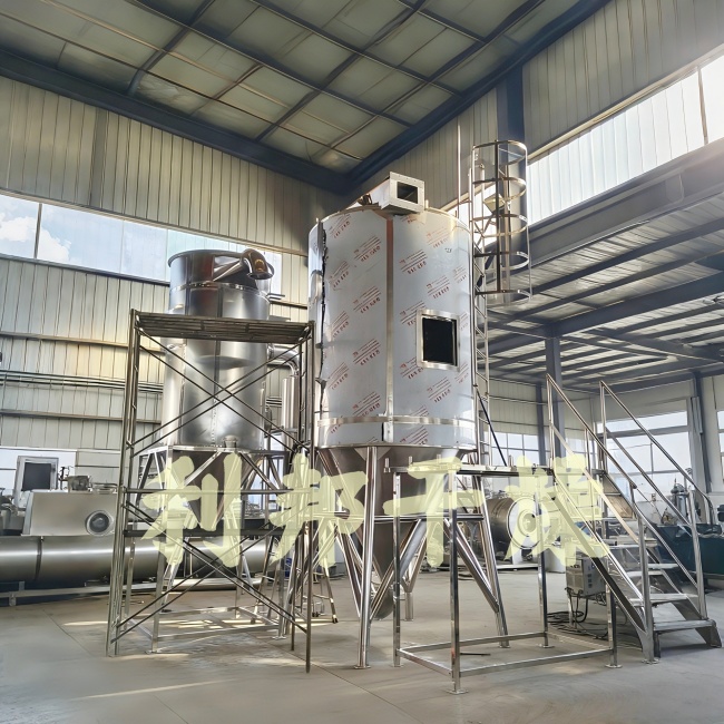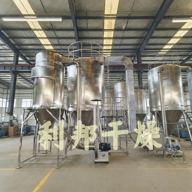 空气经过滤和加热,进入干燥器顶部空气分配器,热空气呈螺旋状均匀地进入干燥室。料液经塔体顶部的高速离心雾化器,(旋转)喷雾成极细微的雾状液珠,与热空气并流接触在极短的时间内可干燥为成品。成品连续地由干燥塔底部和旋风分离器中输出,废气由引风机排空。