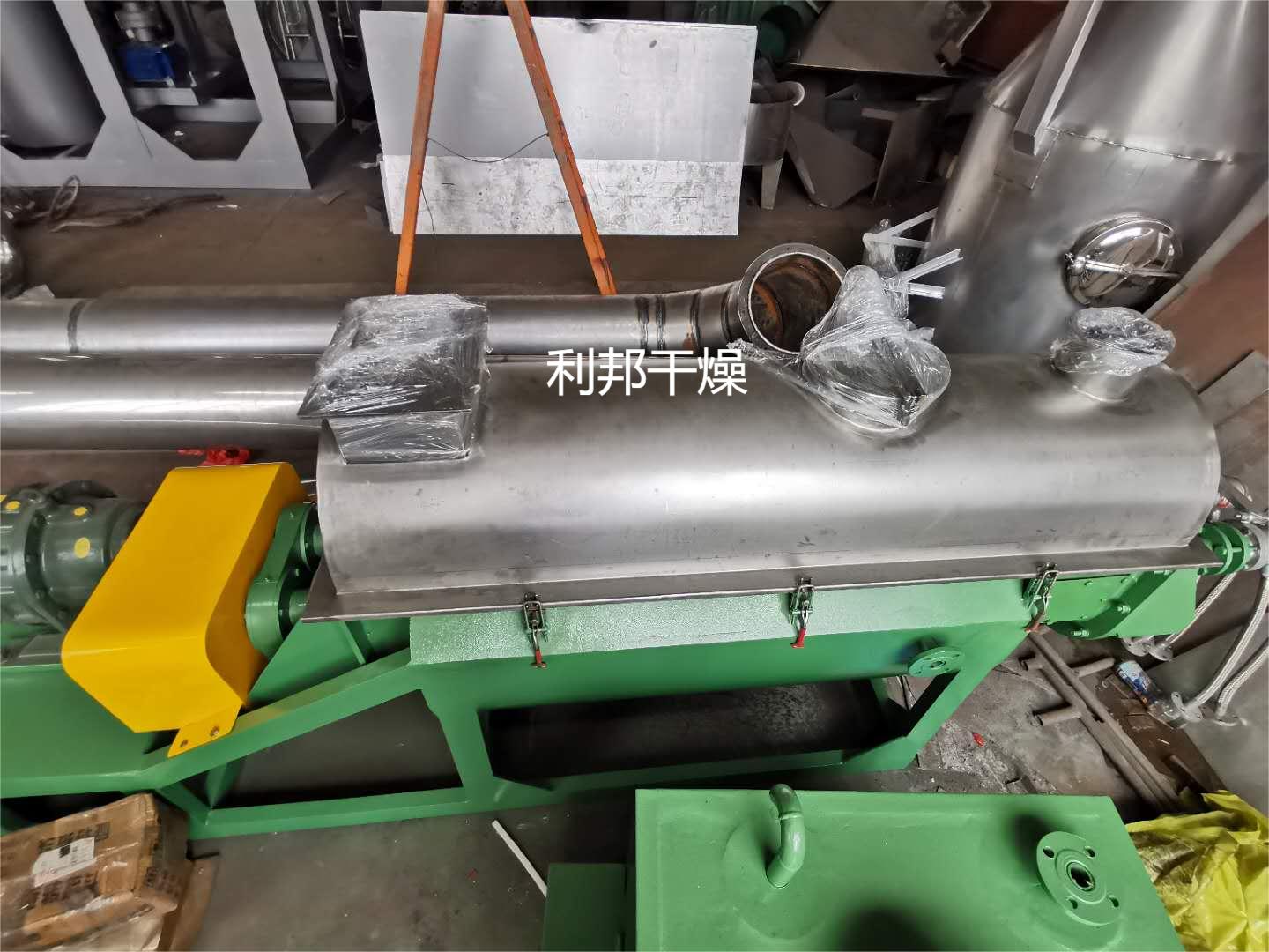 浆叶干燥机已成功地用于食品、化工、石化、染料、工业污泥等领域。设备传热、冷却、搅拌的特性使之可以完成以下单元操作:燃烧(低温)、冷却、干燥(溶剂回收)加热(融化)、反应和灭菌。搅拌浆叶同时又是传热面,使单位有效容积内传热面积增大,缩短了处理时间。楔型浆叶传热面又具有自清洁功能。压缩--膨胀搅拌功能使物料混和均匀。物料沿轴向成'活塞流'运动,在轴向区间内,物料的温度、湿度、混合度梯度很小。用导热油做热介质浆叶干燥机可完成低温燃烧工作。如:二水硫酸钙(Ca2SO4·2H2O) 燃烧转化为半水硫酸钙(Ca2SO4·1/22H2O)。碳酸氢钠(NaHCO3)经煅烧转化为纯碱(Na2HCO3)等。通入冷却介质,如水、冷却盐水等即可用来冷却。如:使用于纯碱行业的浆叶式凉碱机,取代老式的空气冷却凉碱机,节省了能源及尾气处理设备,降低了操作费用。干燥,设备主要的功能,不使用热空气,使溶剂回收、能源消耗、环境控制处于易处理的理想状态。对需回收溶剂、易燃易氧化热敏性物料尤为适应。已广泛用于精细化工、石化、染料行业。轴向区间内,温度、湿度、混合度的均匀性,使得设备可用来加热或融化,或进行一些固体物料反应。在复合肥及变性淀粉行业均已成功使用。浆叶干燥机可用来对食物和面粉进行灭菌处理。单位有效容积内大的加热面积,很快就将物料加热到灭菌温度,避免了长时间加热而改变物料品质。