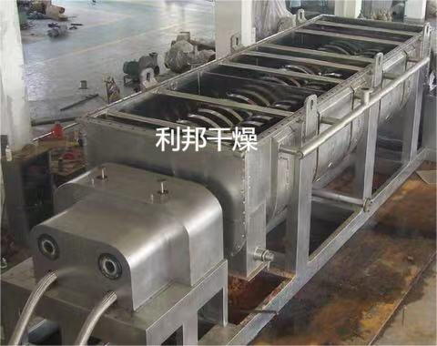 空心轴上密集排列着楔型中空浆叶,热介质经空心轴流经浆叶。单位有效容积内传热面积很大,热介质温度从-40℃到320℃,可以是水蒸汽,也可以是液体型:如热水、导热油等。间接传导加热,没有携带空气带走热量,热量均用来加热物料。热量损失仅为通过器体保温层向环境的散热。楔型浆叶传热面具有自清洁功能。物料颗粒与楔型面的相对运动产生洗刷作用,能够洗刷掉楔型面上附着物料,使运转中一直保持着清洁的传热面。浆叶干燥机的壳体为Ω型,壳体内一般安排二到四根空心搅拌轴。壳体有密封端盖与上盖,防止物料粉尘外泄而充分发挥作用。
