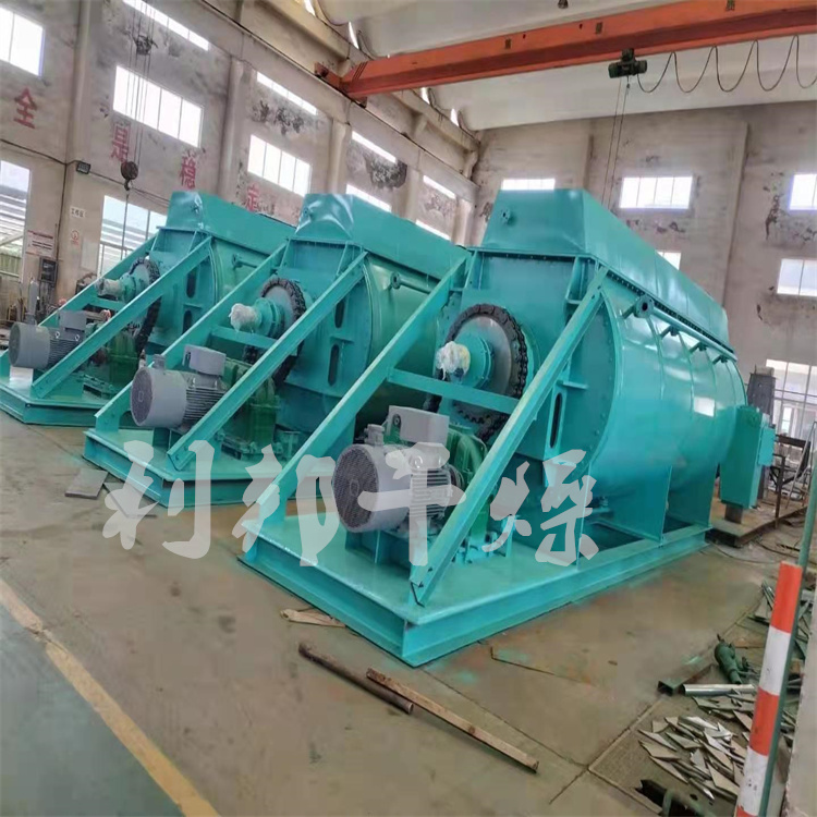 空心轴上密集排列着楔型中空浆叶,热介质经空心轴流经浆叶。单位有效容积内传热面积很大,热介质温度从-40℃到320℃,可以是水蒸汽,也可以是液体型:如热水、导热油等。间接传导加热,没有携带空气带走热量,热量均用来加热物料。热量损失仅为通过器体保温层向环境的散热。楔型浆叶传热面具有自清洁功能。物料颗粒与楔型面的相对运动产生洗刷作用,能够洗刷掉楔型面上附着物料,使运转中一直保持着清洁的传热面。浆叶干燥机的壳体为Ω型,壳体内一般安排二到四根空心搅拌轴。壳体有密封端盖与上盖,防止物料粉尘外泄而充分发挥作用。
