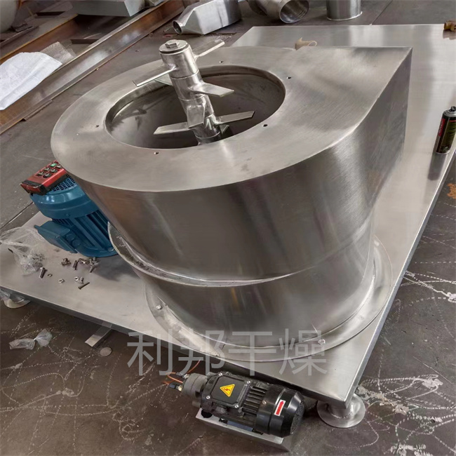 热空气由入口管以适宜的喷动速度从干燥机底部进入搅拌粉碎干燥室,对物料产生强烈的剪切、吹浮、旋转作用,于是物料受到离心、剪切、碰撞、摩擦而被除数微粒化,强化了传质传热。在干燥机底部,较大较湿的颗粒团在搅拌器的作用下被机械破碎,湿含量较低、颗粒度较小的颗粒被旋转气流夹带上升,在上升过程中进一步干燥。由于气固两相作旋转流动,固相惯性大于气相,固气两相间的相对速度较大,强化两相间的传质传热,所以该机生产强度高。