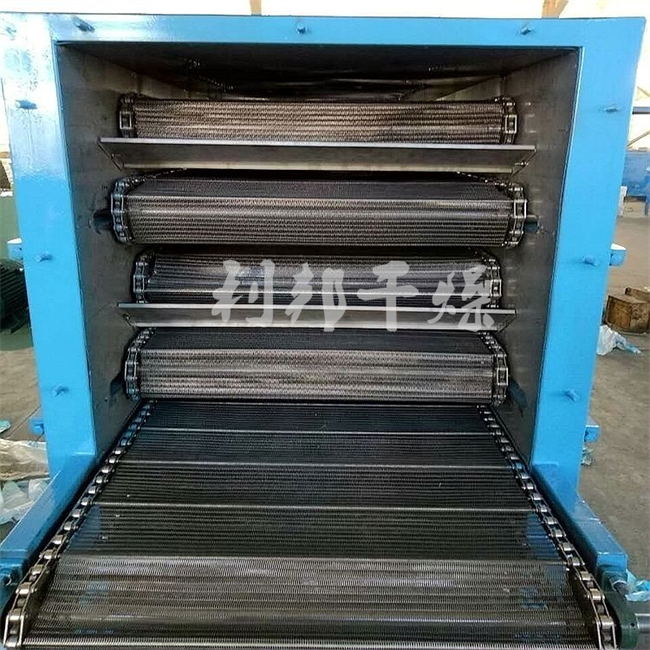 (3)多层带式干燥机:多层带干机常用于干燥速度要求较低、干燥时间较长,在整个干燥过程中工艺操作条件能保持恒定的场合。层间设置隔板以组织干燥介质的定向流动,使物料干燥均匀。多层带干机占地少,结构简单,广泛使用于干燥谷物类物料。但由于操作中要多次装料和卸料,因此不适用于干燥易粘着输送带及不允许碎裂的物料。
