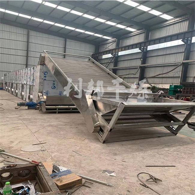 物料由加料器均匀地铺在网带上,网带一般采用12-60目不锈钢丝网,由传动装置拖动在干燥机内移动。干燥机由若干单元组成,每一单元热风独立循环,部分尾气由专门排湿风机排出,废气由调节阀控制,热气由下往上或由上往下穿过铺满物料的网带完成热量与质量传递的进程,带走物料水份。网带缓慢移动,运行速度可根据物料温度自由调节,干燥后的成品连续落入收料器中。上下循环单元根据用户需要可灵活配备,单元数量亦可根据需要选取。