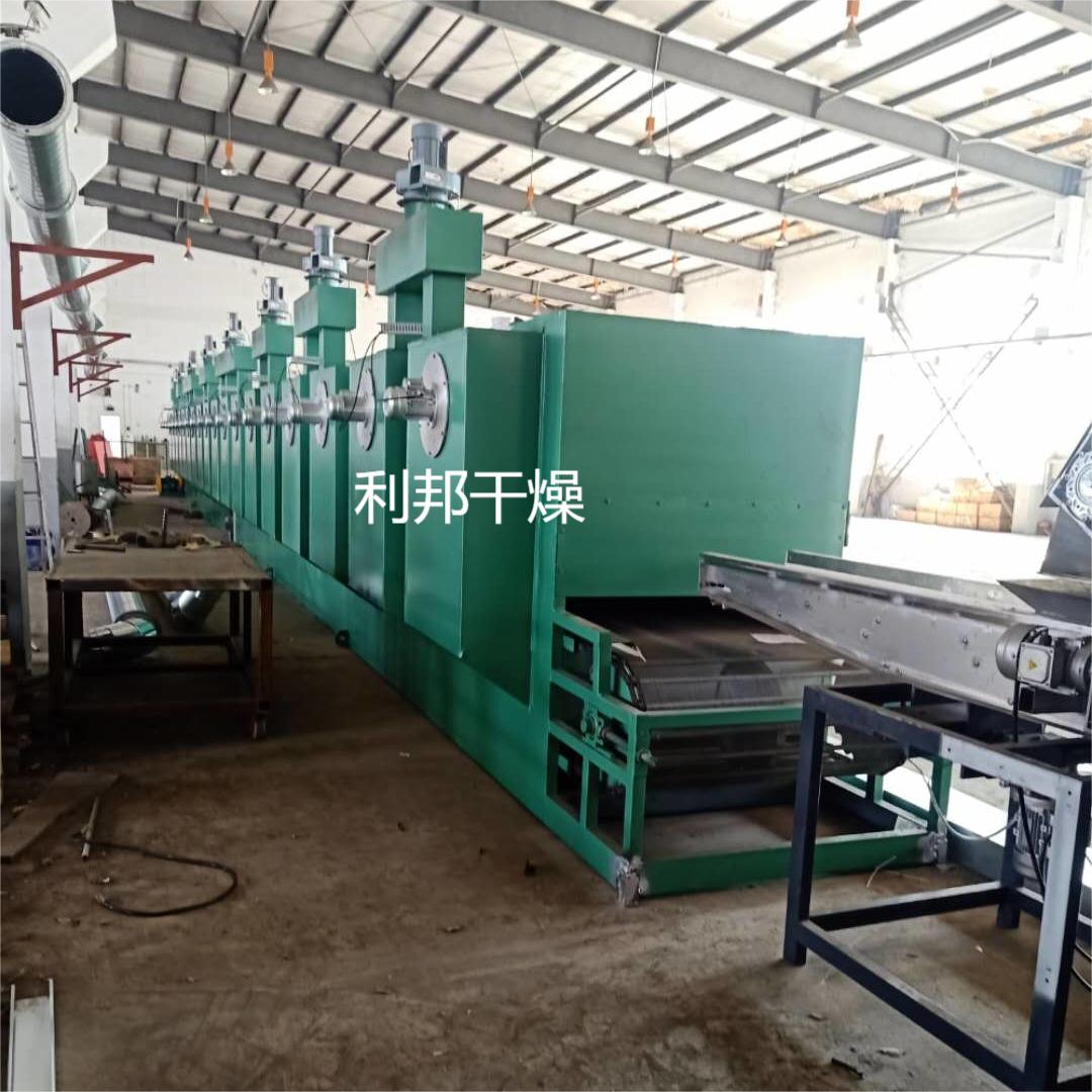 物料由加料器均匀地铺在网带上,网带采用12~60目不锈钢丝网,由传动装置拖动在干燥机内移动。干燥机由若干单元组成,每一单元热风独立循环,其中部分尾气由专门排湿风机排出,每一单元排出废气时均有调节阀控制。热气由上往下或由下往上穿过铺满物料的网带完成热量与质量传递的进程,带走物料水分。网带缓慢移动,运行速度可根据物料温度自由调节,干燥后的成品连续落入收料器中。上下循环单元根据用户需要可灵活配备,单元数量亦可根据需要选取。
