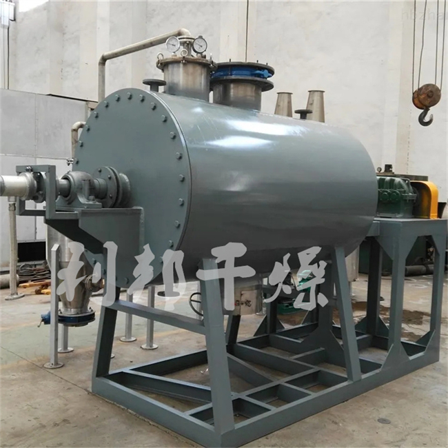 真空耙式干燥机装置用蒸汽夹套间接加热物料,并在高真空下排气,因此特别适应不耐高温、在高温下易于氧化的物料或干燥时容易产生粉末的物料(如各种燃料),以及干燥过程中排除的蒸汽或溶剂必须回收的物料干燥作业。真空耙式干燥机中被干燥物料含水量或溶剂量较高达到90%,而较低的只有15%。被干燥物料有浆状、膏状的、粒状的、粉状的,也可以是纤维状的。这些物料干燥后的含水率一般达到0.1%,甚至0.05%。