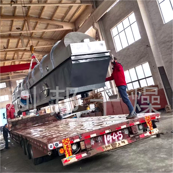 物料自进料口进入机内,在振动力作用下,物料沿水平方向抛掷向前连续运动,热风向上穿过流化床同湿物料换热后,湿空气经旋风分离器(或脉冲式布袋除尘器)除尘后由排风排出,干燥物料由排料口排出,然后收集包装。