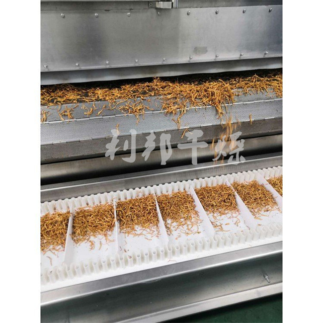 物料由加料器均匀地铺在网带上,网带一般采用12-60目不锈钢丝网,由传动装置拖动在干燥机内移动。干燥机由若干单元组成,每一单元热风独立循环,部分尾气由专门排湿风机排出,废气由调节阀控制,热气由下往上或由上往下穿过铺满物料的网带完成热量与质量传递的进程,带走物料水份。网带缓慢移动,运行速度可根据物料温度自由调节,干燥后的成品连续落入收料器中。上下循环单元根据用户需要可灵活配备,单元数量亦可根据需要选取。