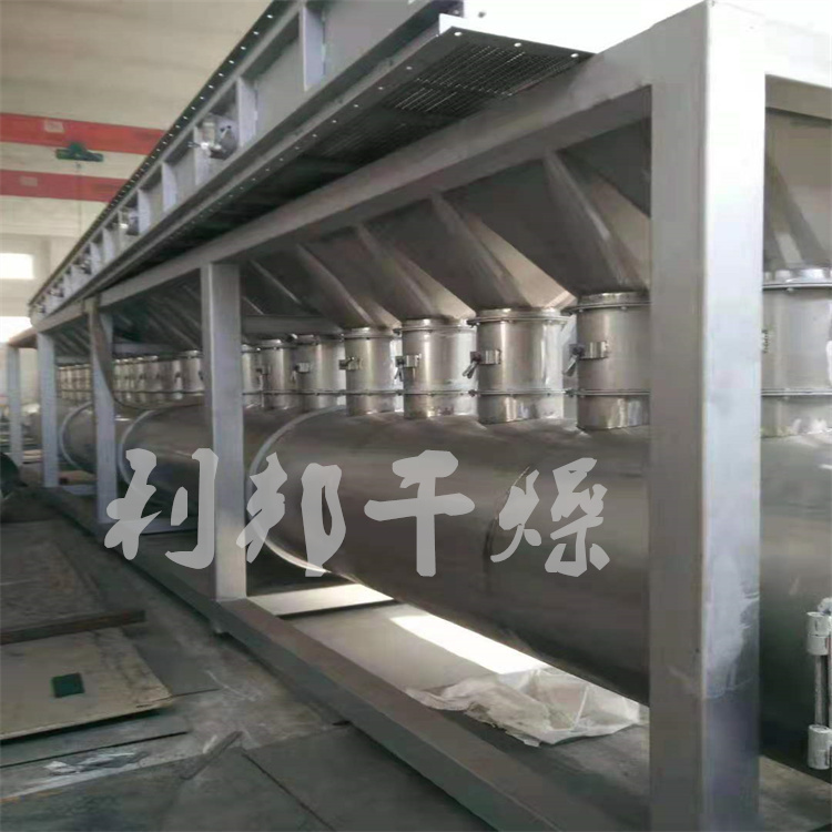 湿物料从干燥机一端投入后,在内筒均布的抄板器翻动下,物料在干燥器内均匀分布与分散,且与并流( 逆流 )的热空气充分接触 ,加快了干燥传流、传质推动力。在干燥过程中,物料在带有倾斜的抄板和热气流作用下,可调控地运动至干燥机另一端星形卸料阀排出成品。