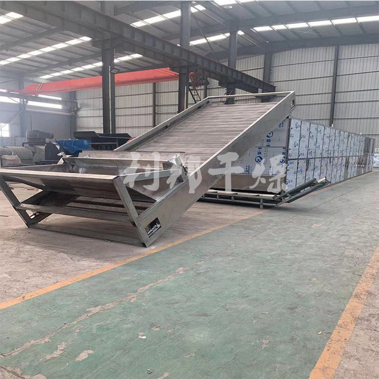 物料由加料器均匀地铺在网带上,网带一般采用12-60目不锈钢丝网,由传动装置拖动在干燥机内移动。干燥机由若干单元组成,每一单元热风独立循环,部分尾气由专门排湿风机排出,废气由调节阀控制,热气由下往上或由上往下穿过铺满物料的网带完成热量与质量传递的进程,带走物料水份。网带缓慢移动,运行速度可根据物料温度自由调节,干燥后的成品连续落入收料器中。上下循环单元根据用户需要可灵活配备,单元数量亦可根据需要选取。
