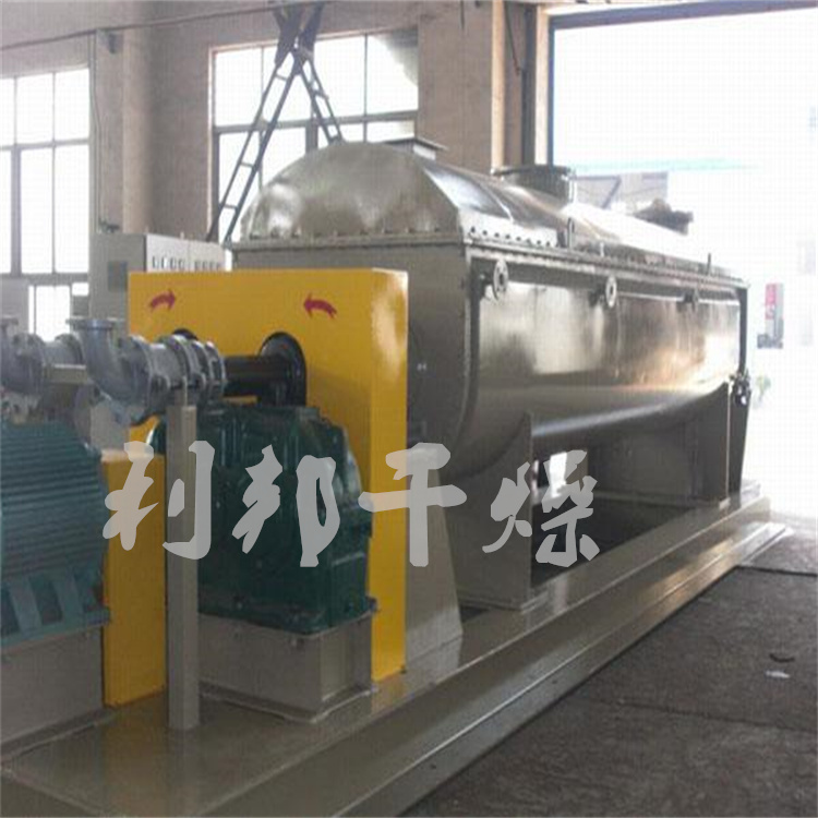 干燥机以蒸汽,热水或导热油作为加热介质,轴端装有热介质导入导出的旋转接头。加热介质分为两路,分别进入干燥机壳体夹套和桨叶轴内腔,将器身和桨叶轴同时加热,以传导加热的方式对物料进行加热干燥。被干燥的物料由螺旋送料机定量地连续送入干燥机的加料口,物料进入器身后,通过桨叶的转动使物料翻转、搅拌,不断更新加热介面,与器身和桨叶接触,被充分加热,使物料所含的表面水分蒸发。同时,物料随桨叶轴的旋转成螺旋轨迹向出料口方向输送,在输送中继续搅拌,使污泥中渗出的水分继续蒸发。干燥均匀的合格产品由出料口排出。