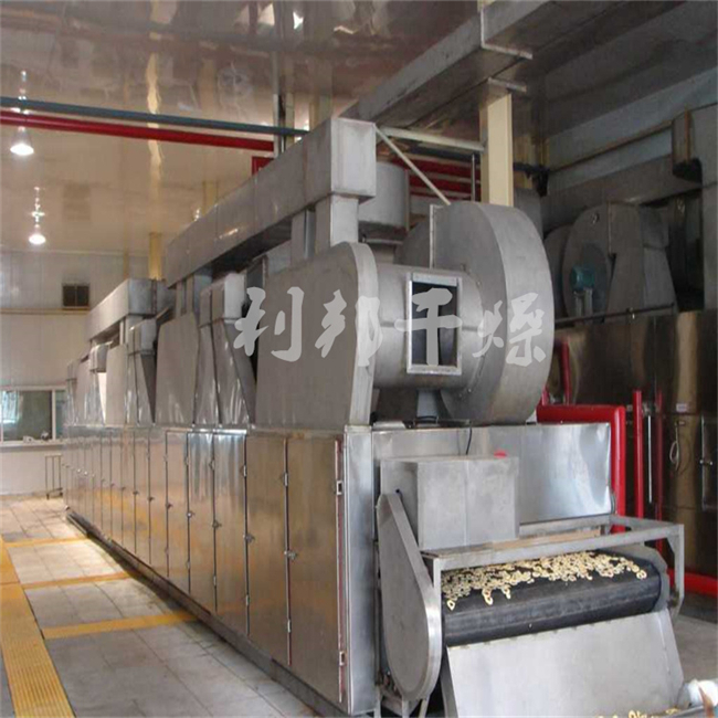 物料由加料器均匀地铺在网带上,网带采用12-60目不锈钢丝网。由传动装置拖动在干燥机内移动。干燥机由若干单元组成,每一单元热风独立循环,部分尾气由专门排湿风机排出,废气由调节阀控制,热气由下往上或由上往下穿过铺在网带上的物料,加热干燥并带走水分。网带缓慢移动,运行速度可根据物料温度自由调节,干燥后的成品连续落入收料器中。上下循环单元根据用户需要可灵活配备,单元数量可根据需要选取。
